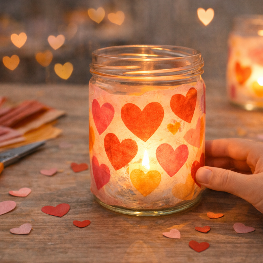 Innen ein LED-Teelicht → fertig ist ein warmes Valentinslicht.