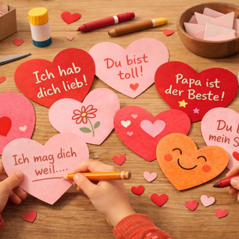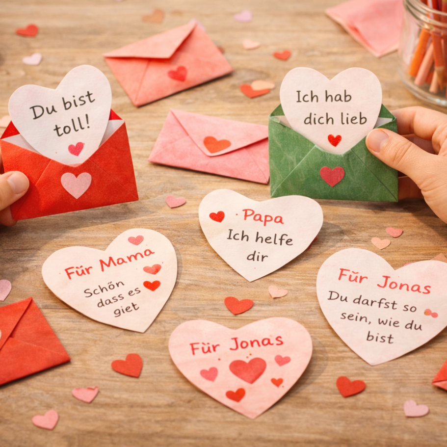 Jedes Familienmitglied bastelt einen kleinen Umschlag oder faltet ein Papierherz.