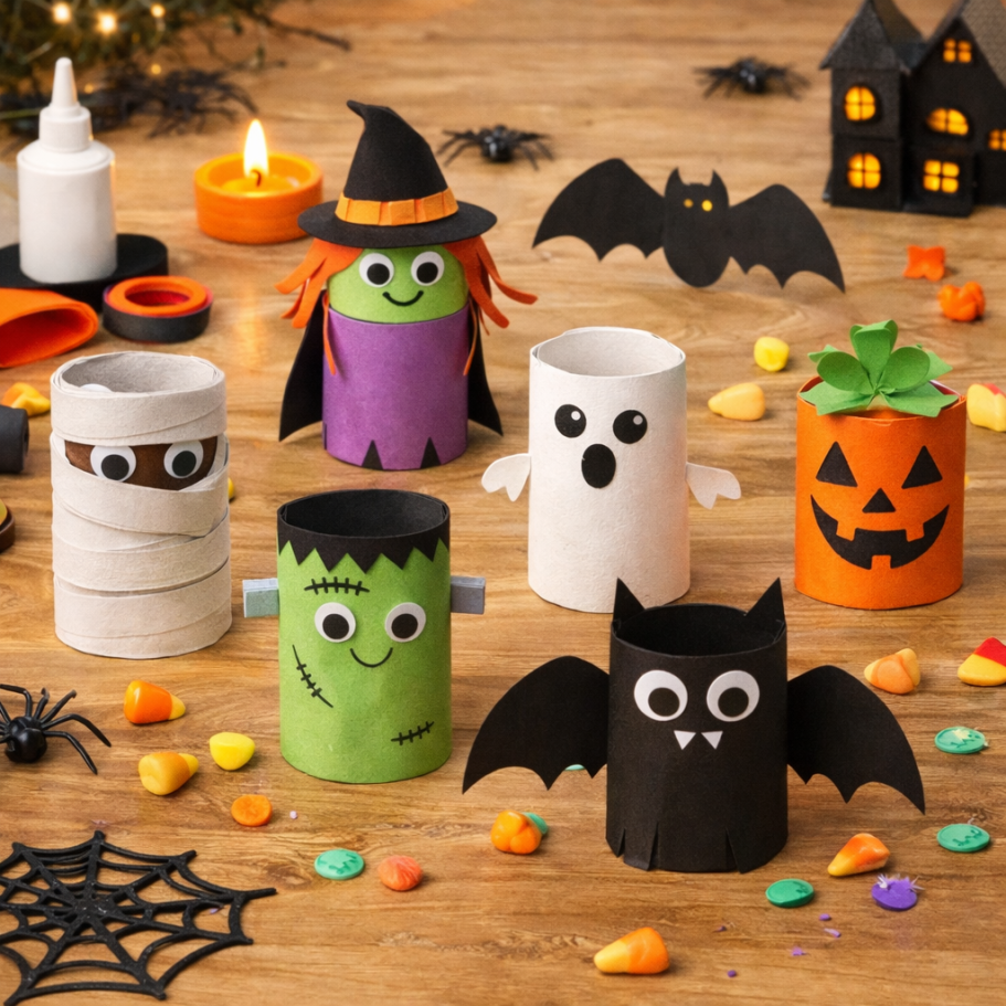süße Figuren, wie Fledermäuse, Geister und Hexen