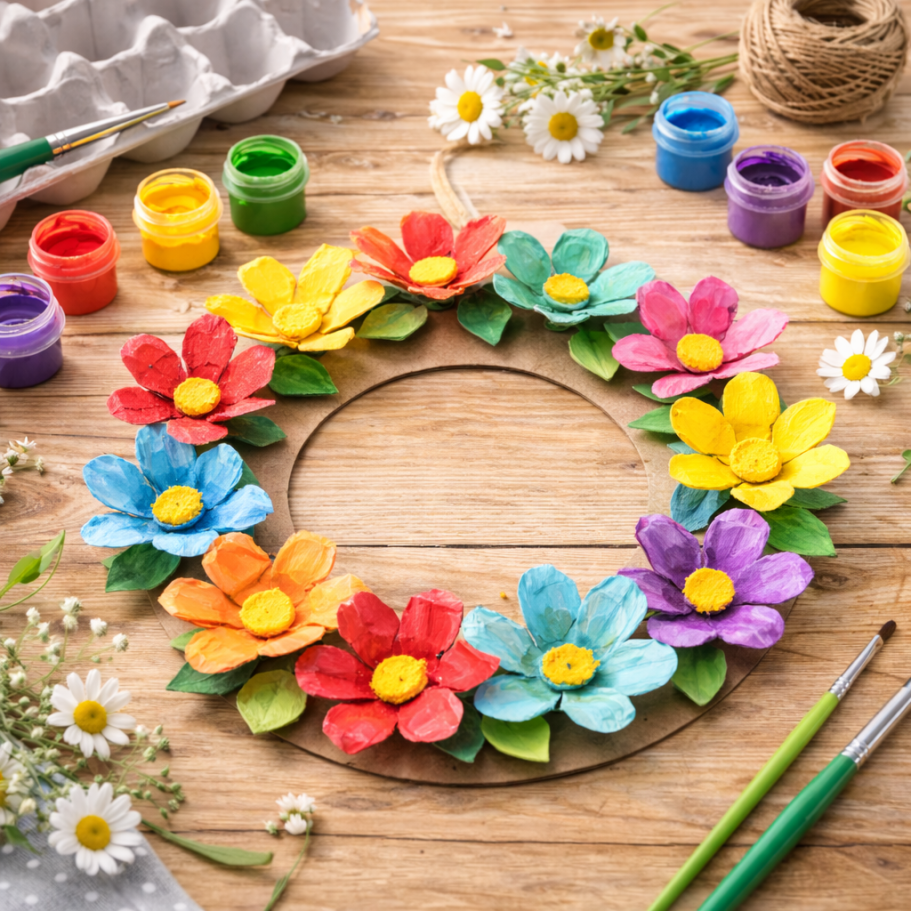 Material: Eierkarton, Acrylfarbe, Pappe als Kranzgrund