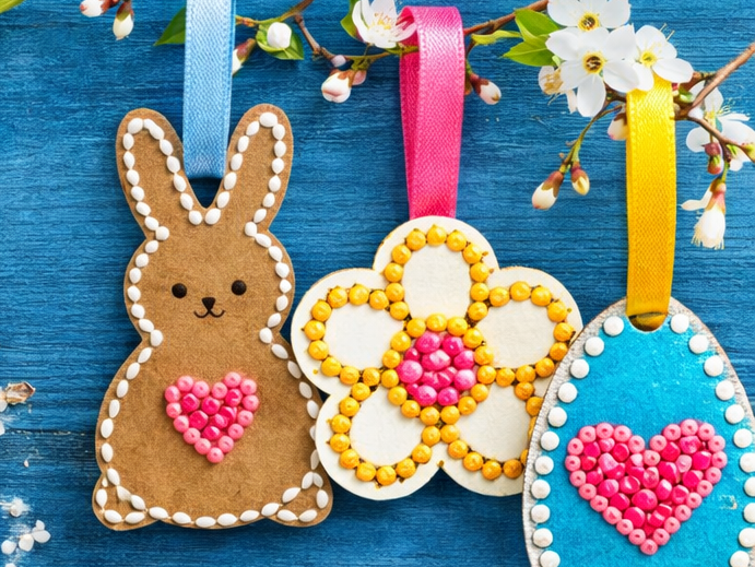 Aus Karton oder Holz kannst du Hasen, Eier oder Blumen ausschneiden und anschließend mit Steinchen verzieren.