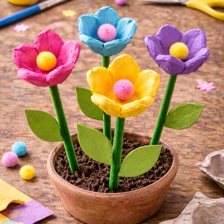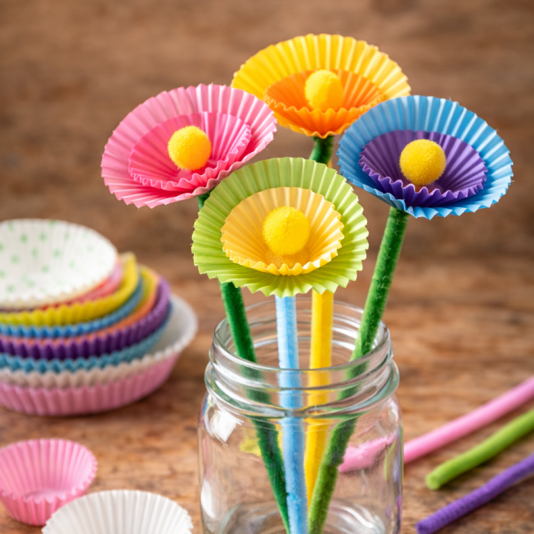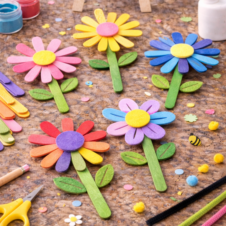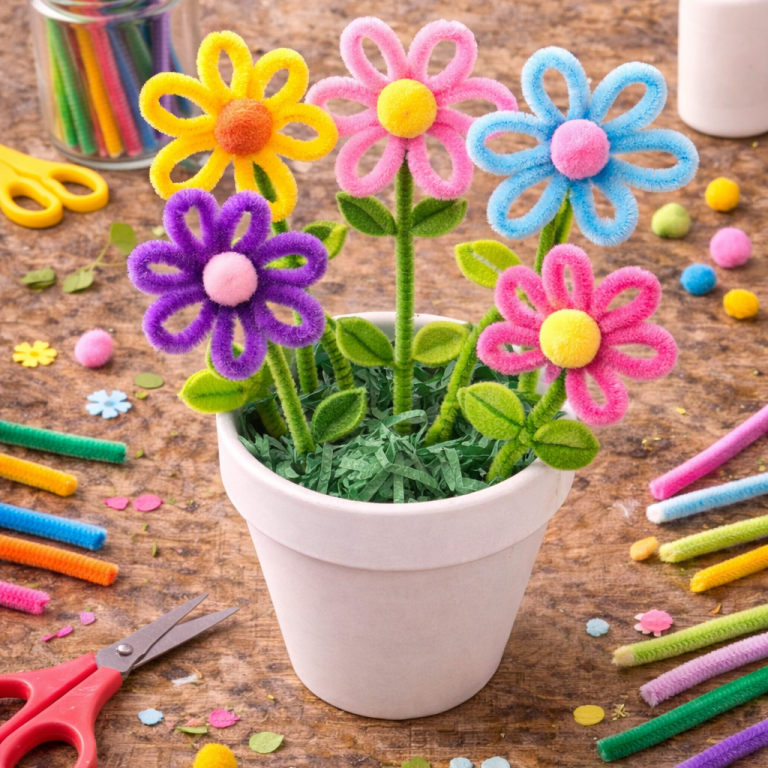 Bunte Blumen aus Pfeifenreinigern sind eine einfache und kreative Frühlingsbastelei für Kinder. Mit wenigen Handgriffen entstehen farbenfrohe Blüten für Vasen, Karten oder Fensterdeko.