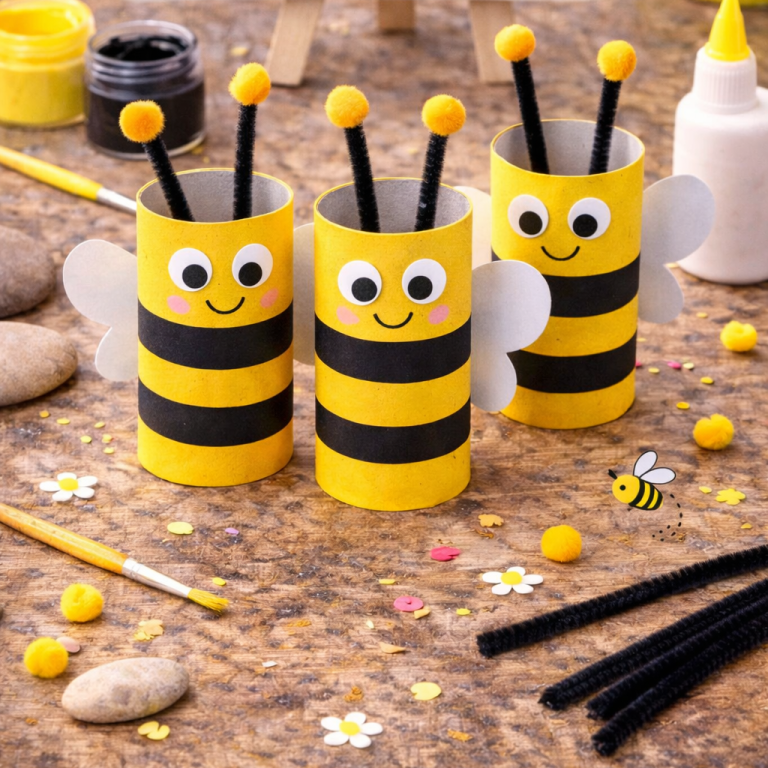 Leere Klorollen werden mit etwas Farbe und Papier zu süßen kleinen Bienen. Eine tolle Upcycling-Bastelidee für den Frühling, die auch jüngeren Kindern viel Spaß macht.