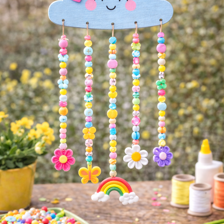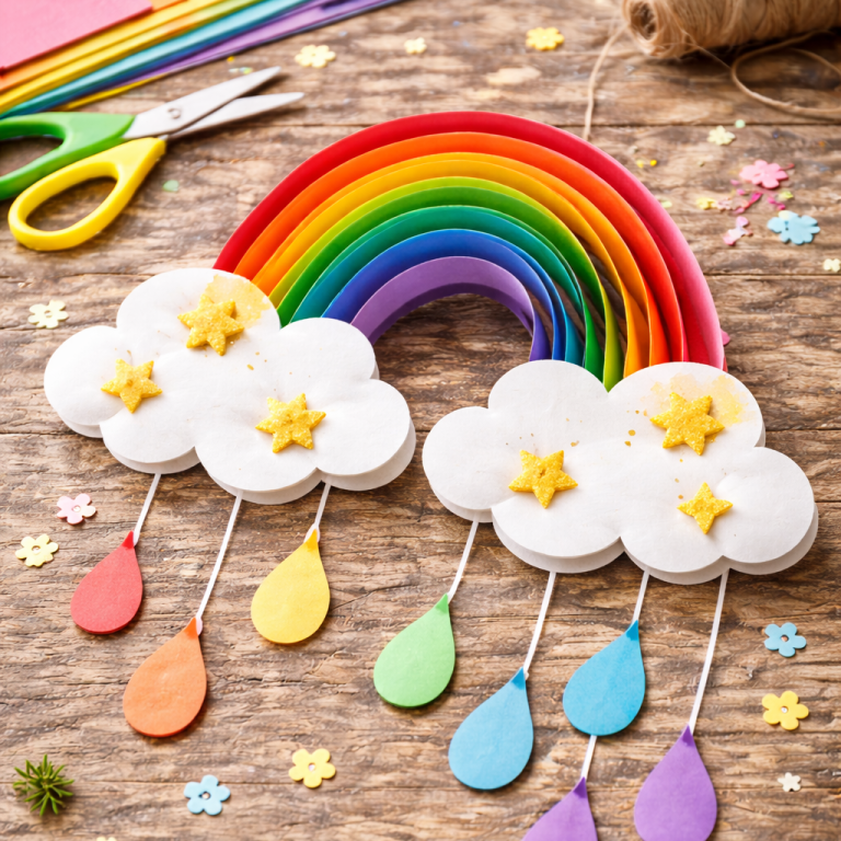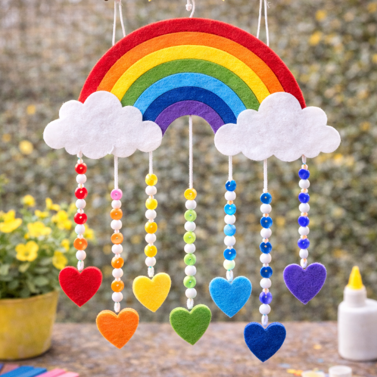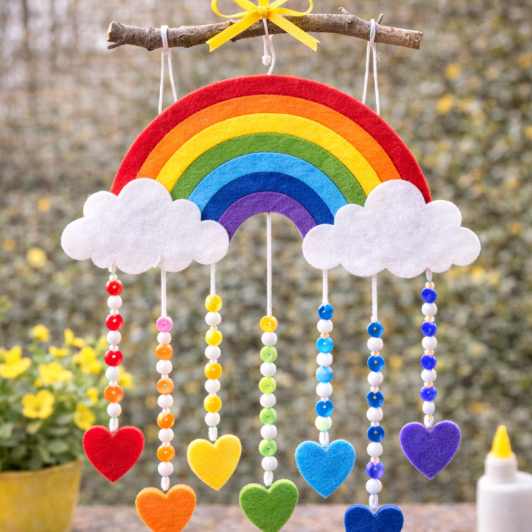 Ein selbstgebasteltes Regenbogen-Mobile bringt Farbe ins Kinderzimmer. Aus Papier, Wolle oder Perlen entsteht eine fröhliche Dekoration, die sanft im Wind schwingt.