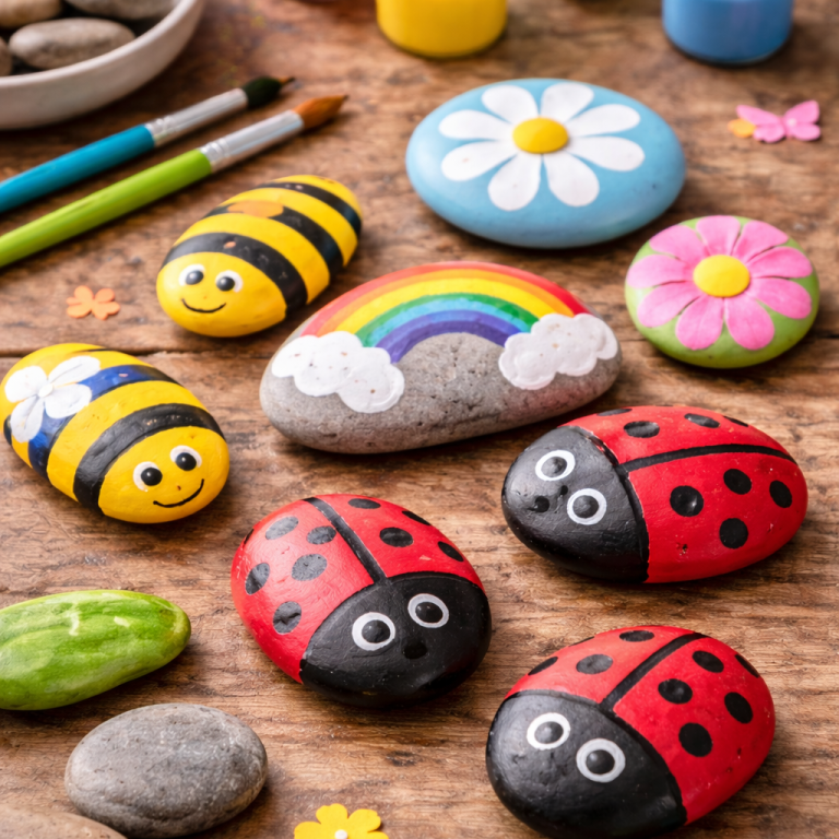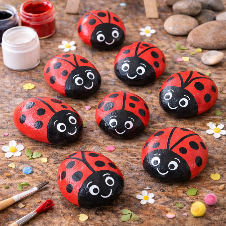 Bemalte Steine verwandeln sich im Handumdrehen in niedliche Marienkäfer. Diese einfache Bastelidee eignet sich perfekt für den Garten, als Deko im Blumentopf oder als kleines Geschenk.