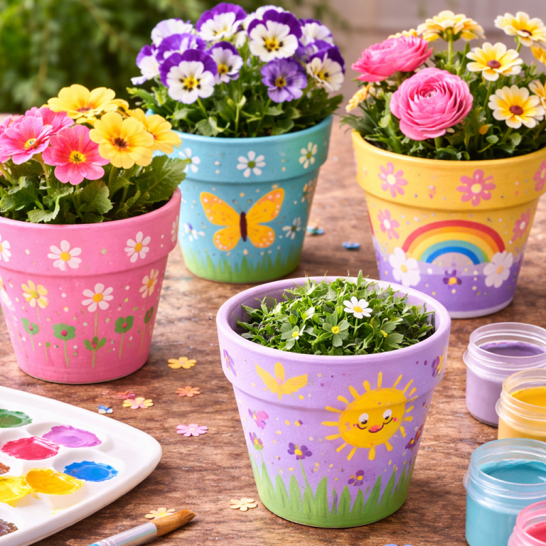 Ein bemalter Terracotta-Topf wird schnell zum individuellen Hingucker. Kinder können Blumen, Muster oder Tiere aufmalen und so ihren eigenen Frühlingsblumentopf gestalten.
