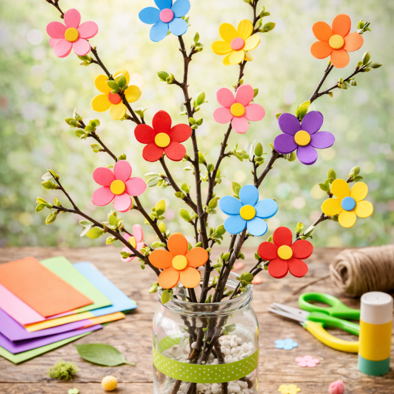 Ein paar Zweige in eine Vase stellen und mit selbst gebastelten Blüten schmücken.