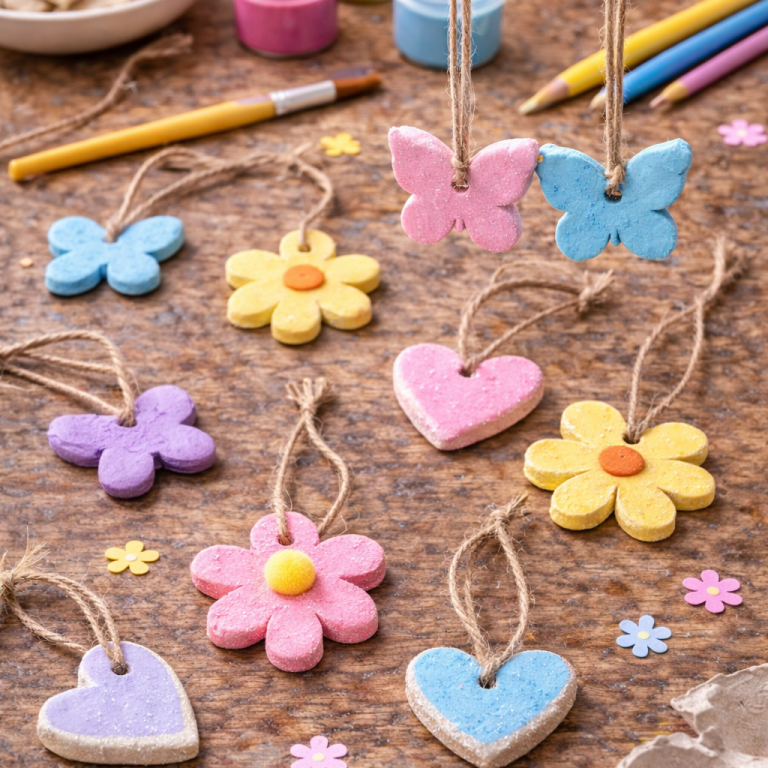 Formen ausstechen (Blumen, Schmetterlinge) und nach dem Trocknen bemalen.