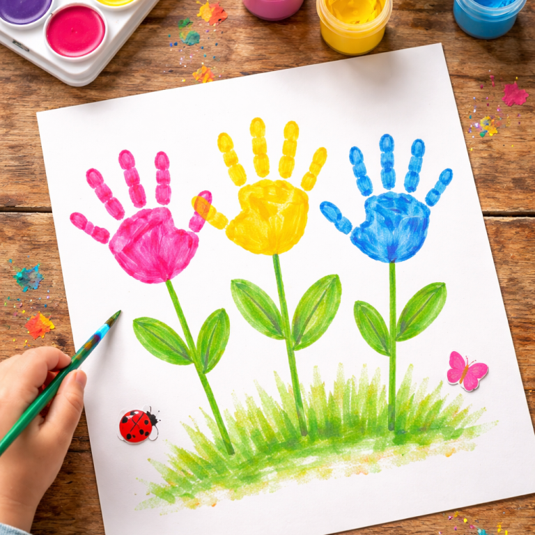Kinder lieben Handabdrücke. Aus bunten Handabdrücken entstehen wunderschöne Blumen.