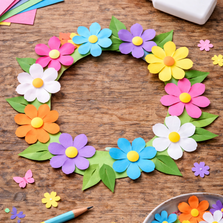 Ein einfacher Kranz für Tür oder Kinderzimmer. Viele kleine Blumen ausschneiden und auf einen Pappring kleben.